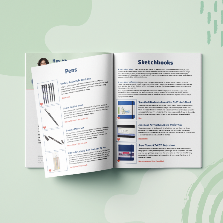 In this free PDF, get a curated list of all of my favorite sketching products like pens, markers, software, apps, hardware, accessories, and more!