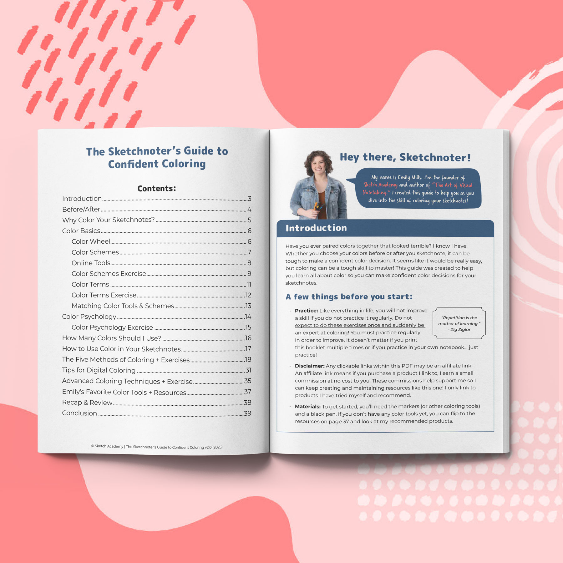 In this PDF workbook, learn how to Master the foundations of color theory, Create color schemes that look awesome, Communicate with color psychology, Use the 5 methods of coloring sketchnotes, and color digitally using apps.