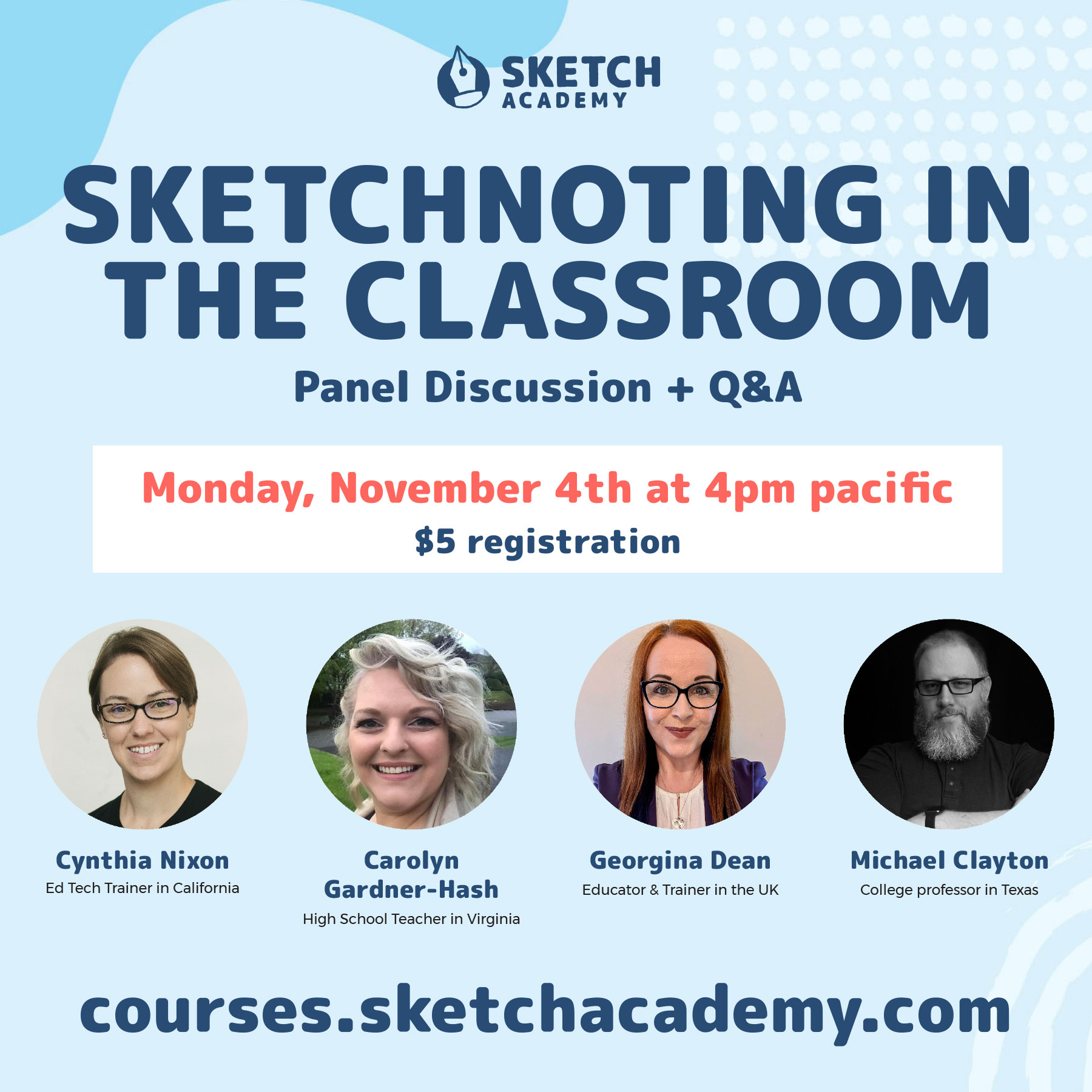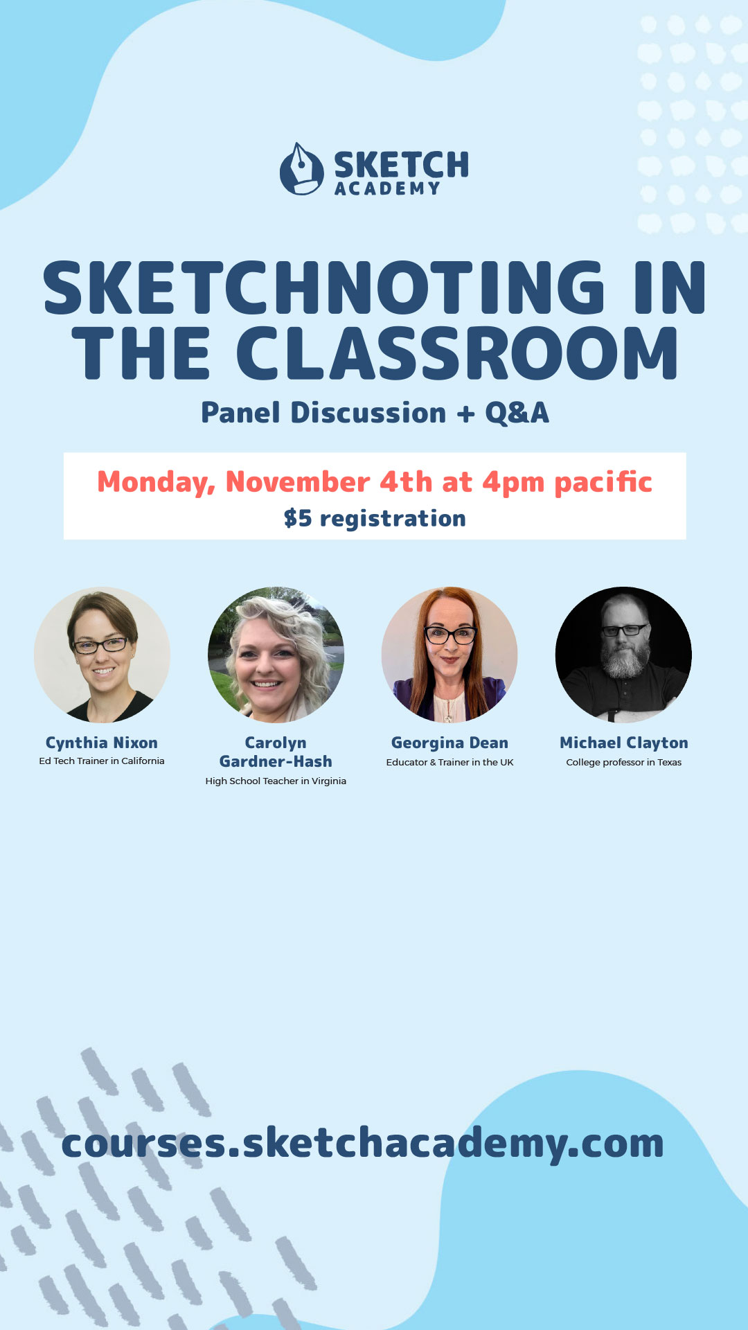A practical panel discussion about sketchnoting in the classroom. Our panelists will share their experiences introducing sketchnoting to their students and how they integrated sketchnoting into their teaching.