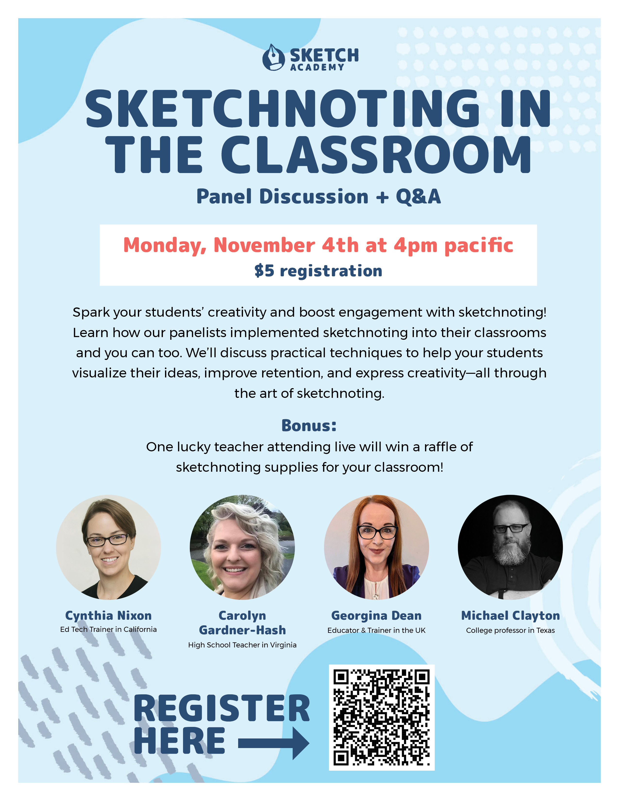 $5 or use code TEACHER to register for free. All proceeds will go towards a prize of sketchnoting supplies for a classroom, raffled at the end of the event to a live attendee.